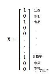 return 0vec2Classify 是需要分类的新闻进行分词操作后每个词语在总词表中出现的次数,没有出现的则为0,有出现的为1。以”江西公布食品抽检情况 样品总体合格率95.67%”为例,它分词后的结果是:[‘江西’, ‘公布’, ‘食品’, ‘抽检’, ‘情况’, ‘ ‘, ‘样品’, ‘总体’, ‘合格率’, ‘95.67%’],转换成向量则如下图所示: