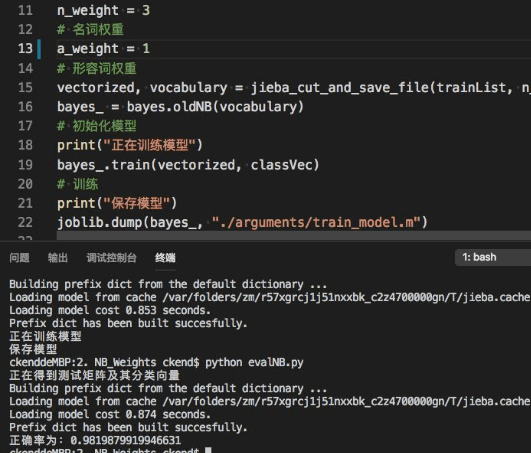 return vectorized, vocabulary最后,在主函数调用的时候传入你想需要的参数即可,你可以按照代码,修改任意词性权重,不过要注意结巴的词性表(每种词性的字母),你可以搜索“ictclas 词性表”得到。