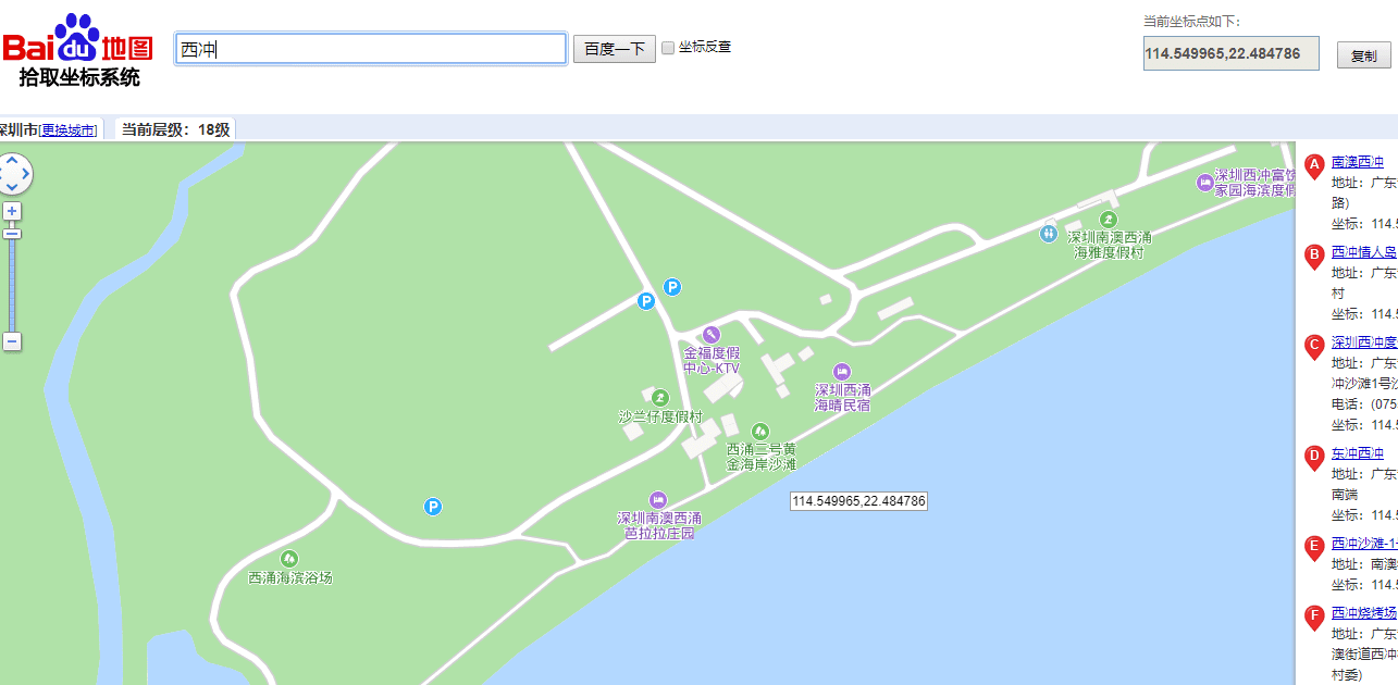 3.然后搜索我们想要的地点:西冲 , 然后找到我们想要去的沙滩