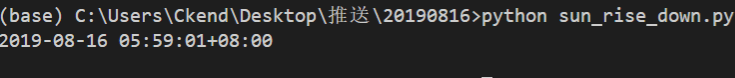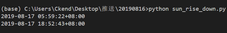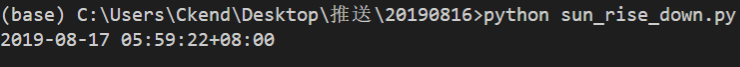 sunset = location_XiChong.sunset(date=datetime.date(2019, 8, 17), local=True) time_sunset_new = str(sunset) print(time_sunset_new)