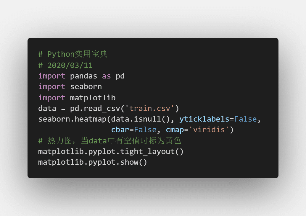这时候就要善用工具了:7行代码巧用Python热力图可视化表格缺失数据,丰富的知识积累在这个时候就能派上用场。生成热力图: