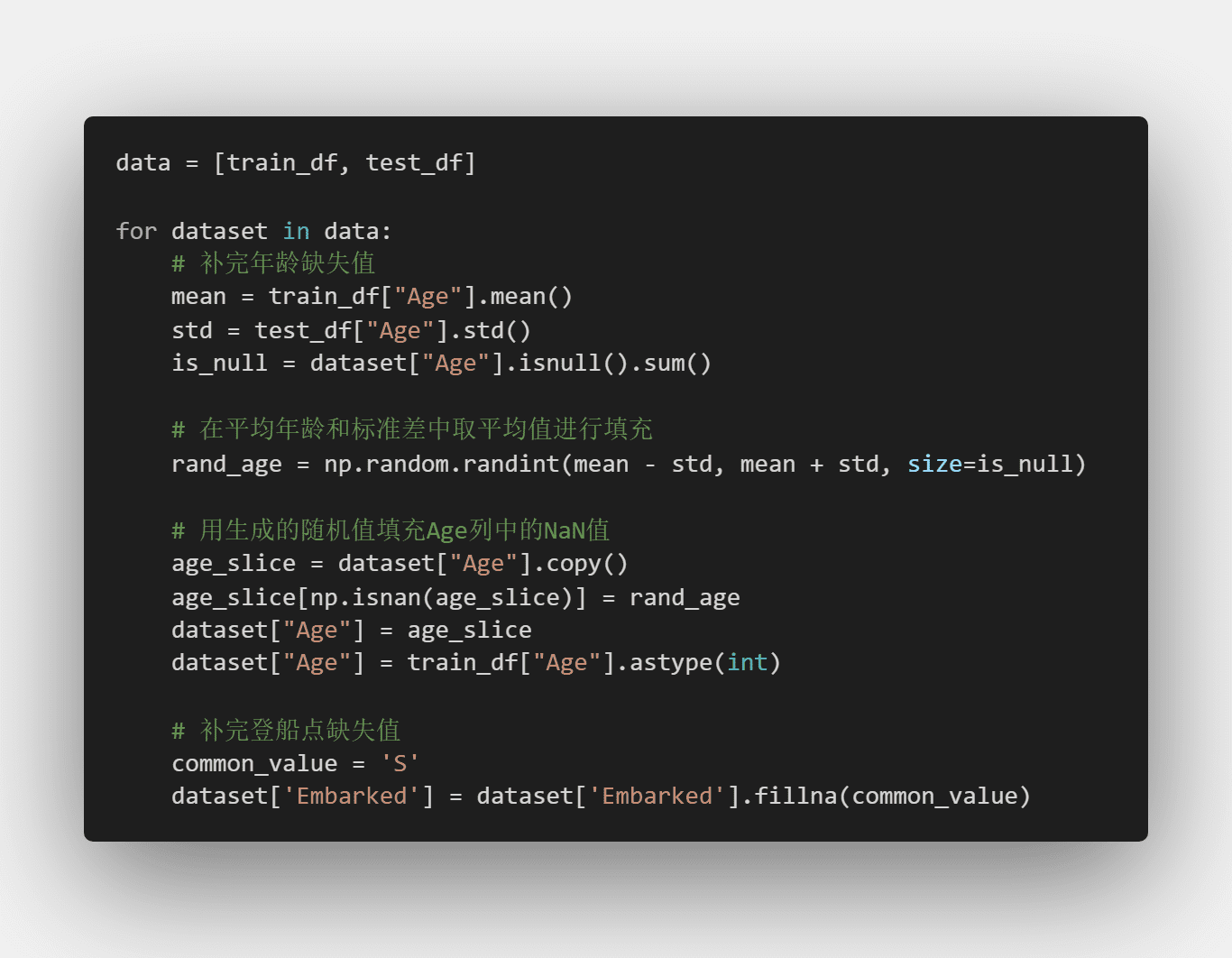 当然还得补完整我们的缺失值。根据年龄的平均值和标准差求得年龄的随机数,填充缺失的年龄数据。登船点均用S地来替代。