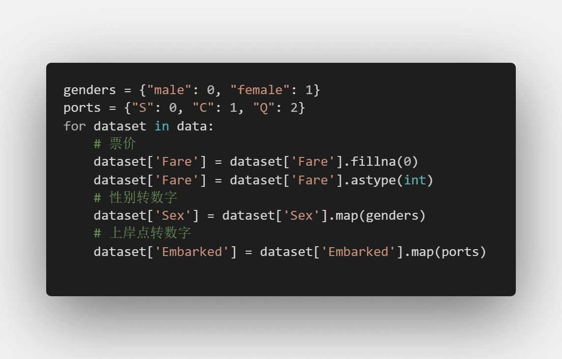 由于年龄是一个一个的数字,在数据量不够大的情况,这样一个一个的数字没太大意义,我们要按照年龄段进行划分,票价也是如此,我们一起转化了: