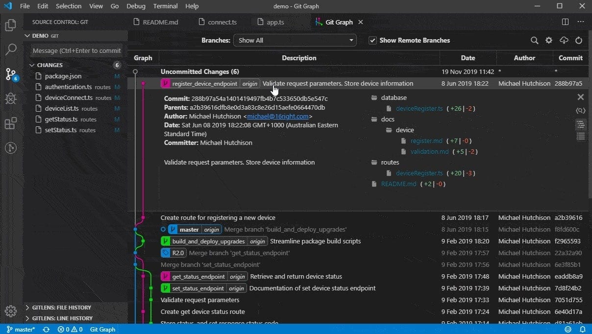 通过这个扩展,可以清楚地看见当前分支的commit记录和变化,可以通过按钮的方式轻易地创建、切换分支、cherry pick、merge等操作。